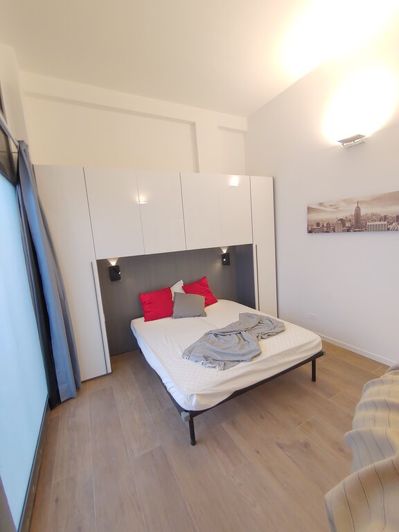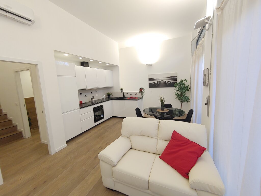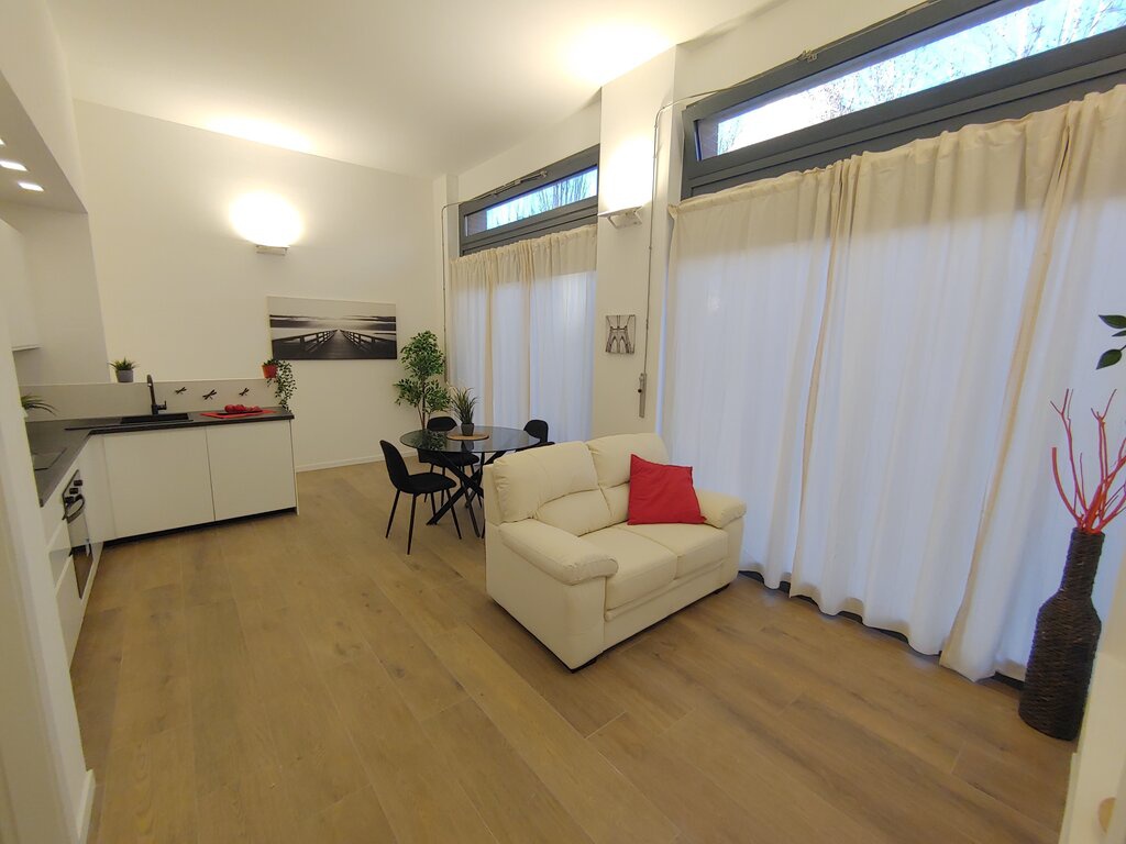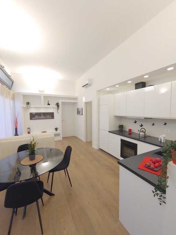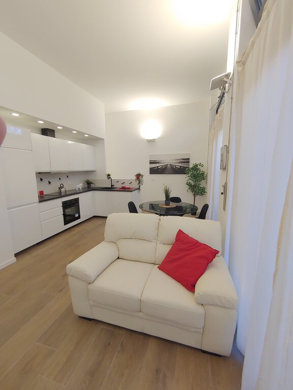 Si tratta nello specifico di un appartamento ubicato all'interno di uno stabile signorile di recente costruzione, composto da ingresso, soggiorno doppio con cucina a vista angolare, attrezzato con struttura per televisore in cartongesso, un bagno completo con sanitari sospesi e ampia doccia, una camera da letto ed un ripostiglio in quota.