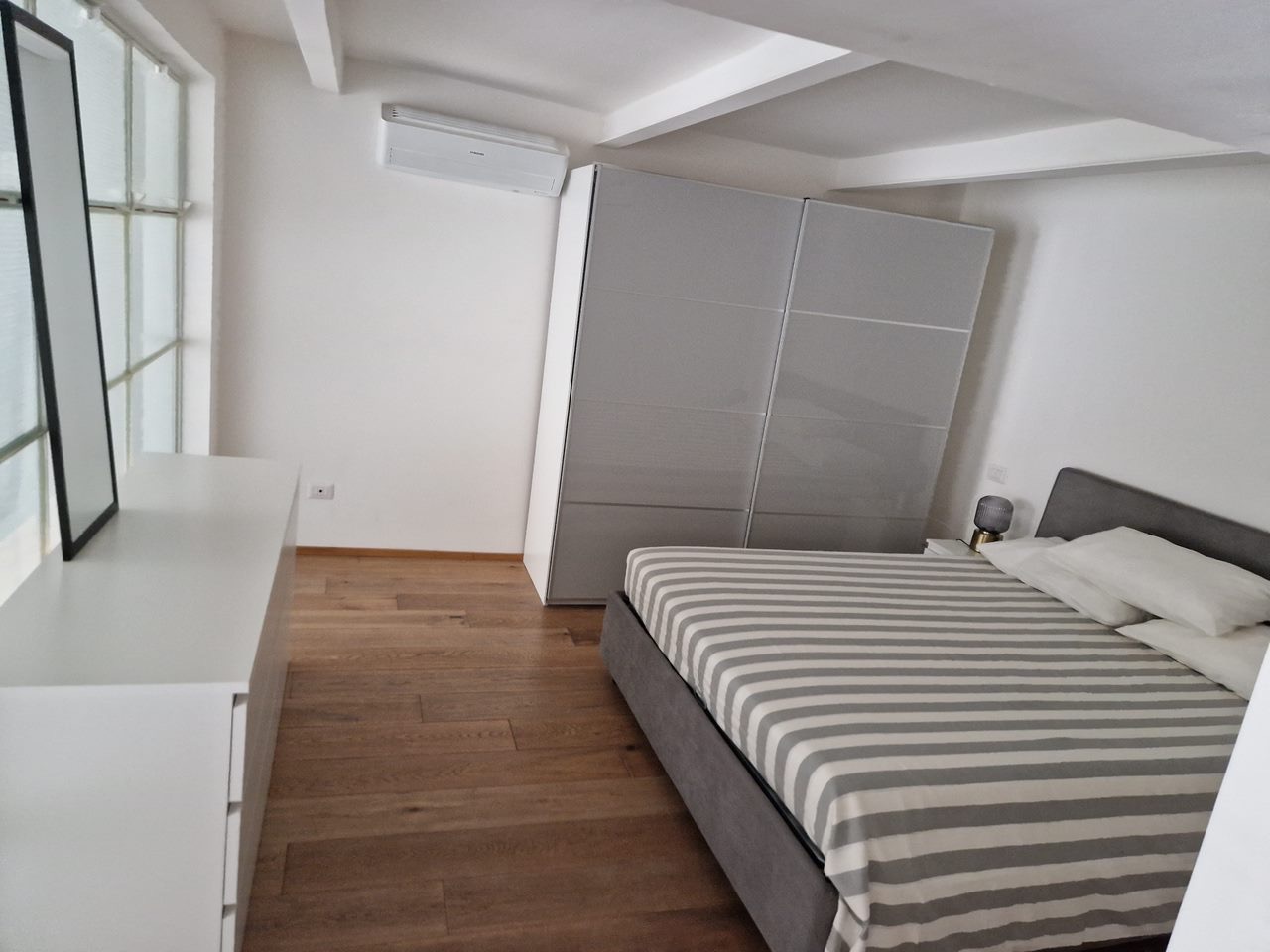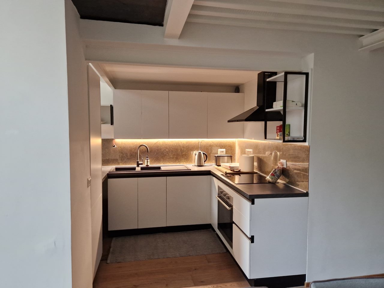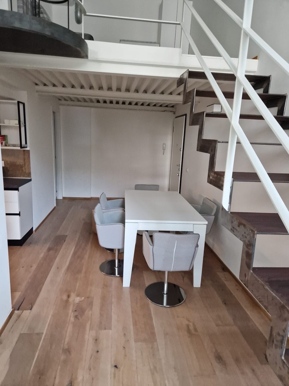L'appartamento, recentemente ristrutturato e arredato con gusto, è composto da un ingresso che conduce a una luminosa zona pranzo con cucina a vista e un'ampia zona giorno, ideale per momenti di relax o per intrattenere amici e familiari. Una scala elegante porta alla zona notte, che include una camera matrimoniale e una seconda camera con divano letto, perfetta per ospiti.