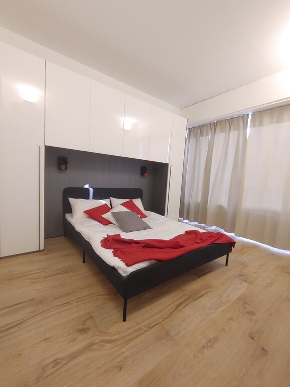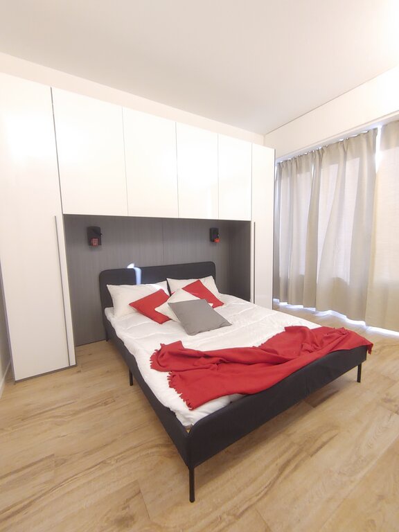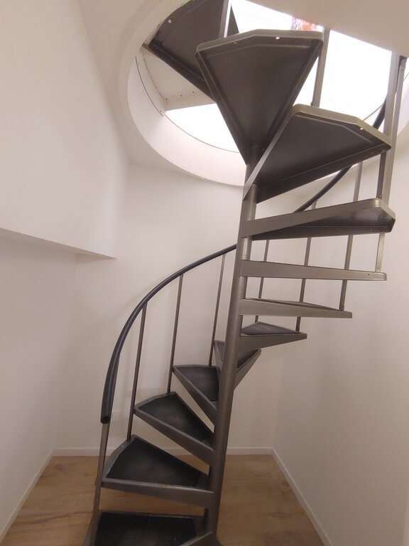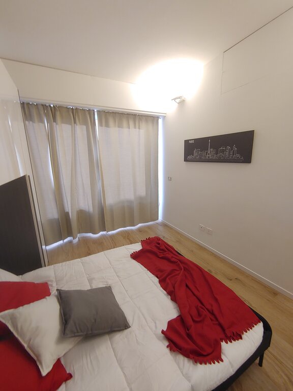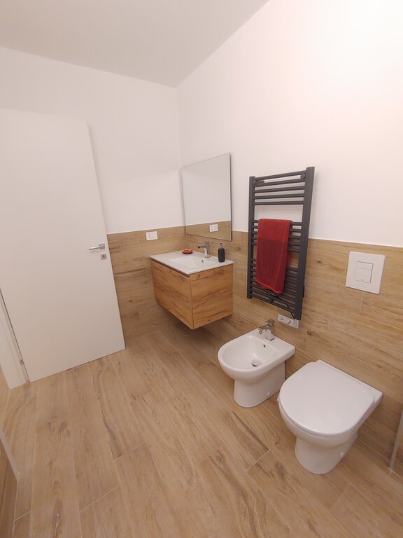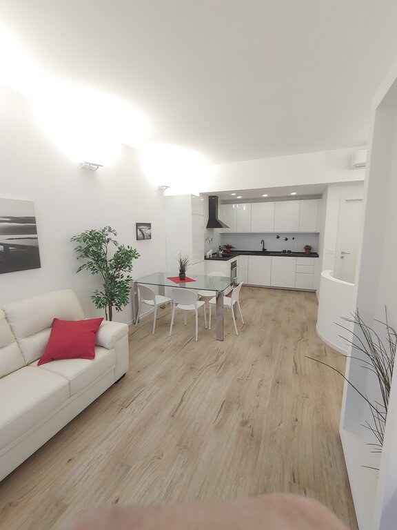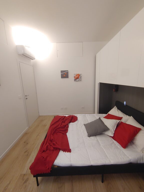 L'appartamento presenta una zona giorno accogliente con un luminoso soggiorno e una cucina a vista angolare dotata di arredi di design. La camera matrimoniale è spaziosa e il ripostiglio in quota permette di ottimizzare gli spazi. Il bagno di design, con sanitari sospesi e un'ampia doccia, aggiunge un tocco di eleganza.