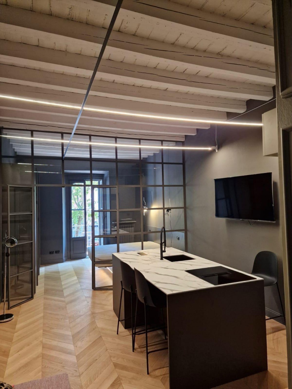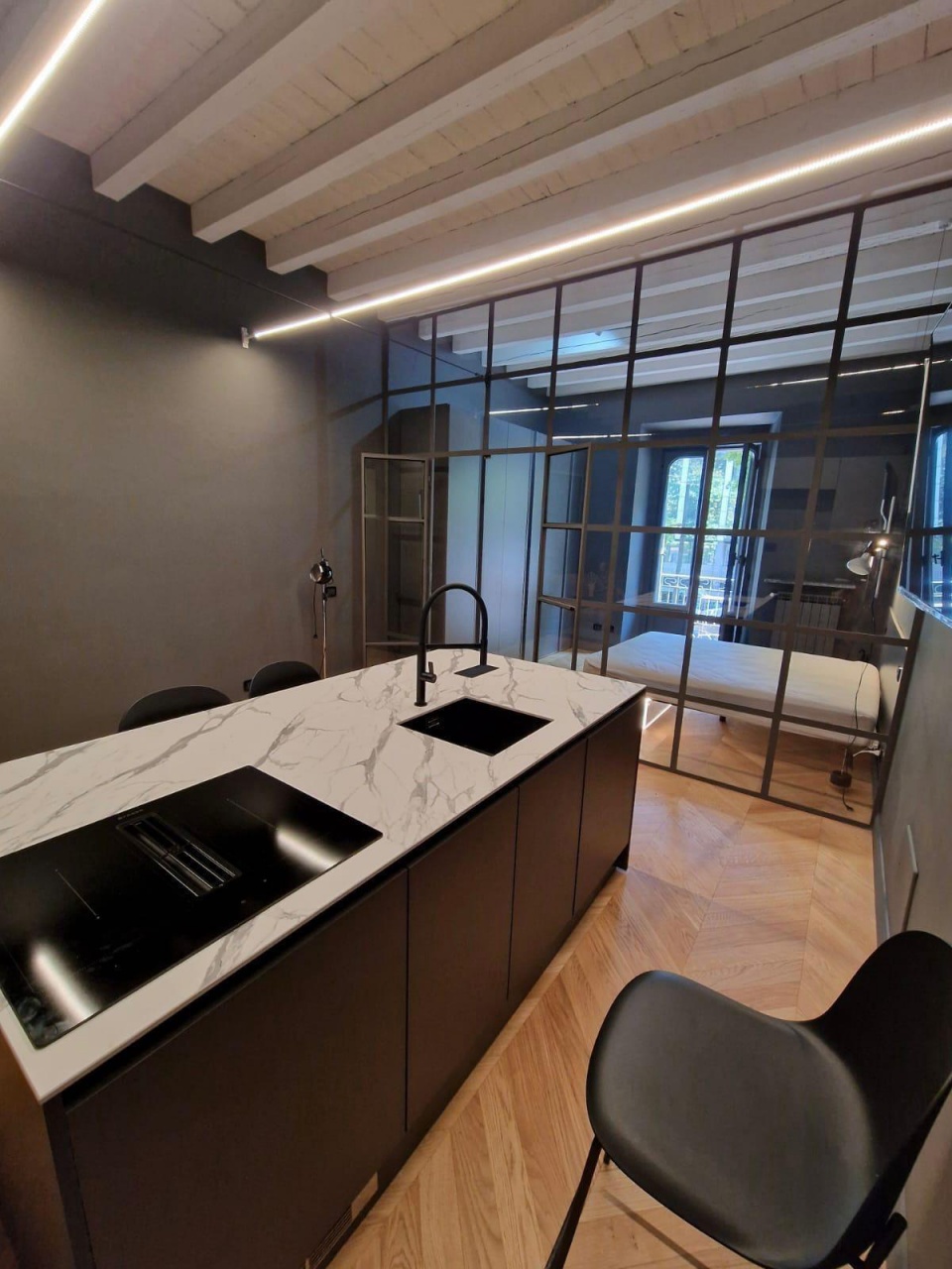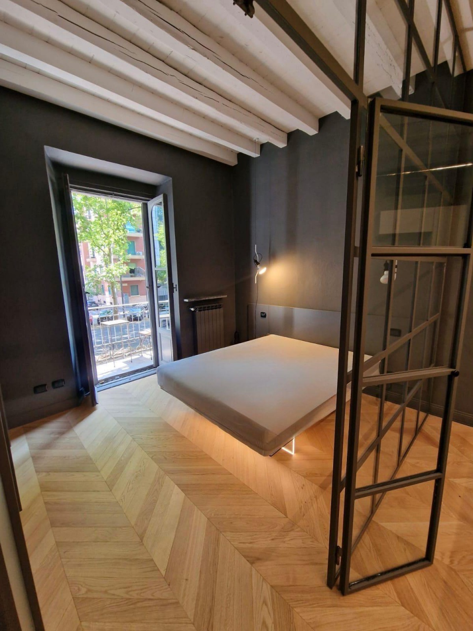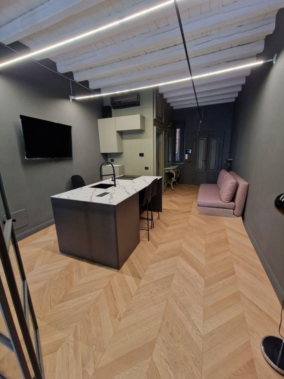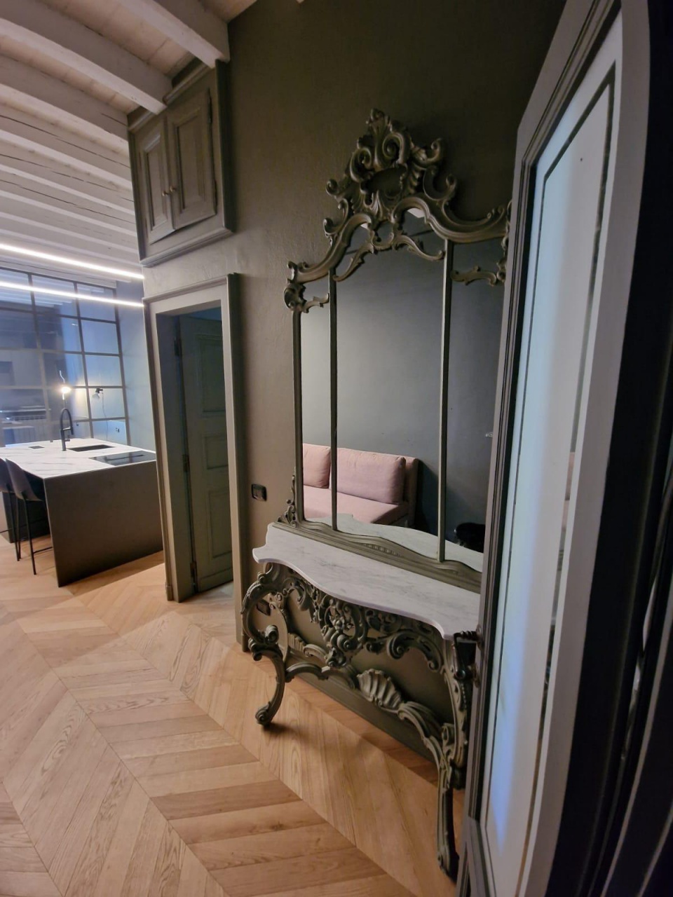 Gli interni, impreziositi da parquet in rovere e soffitti alti con travi in legno a vista, offrono un'atmosfera calda e accogliente, un perfetto equilibrio tra charme classico e comfort moderno.